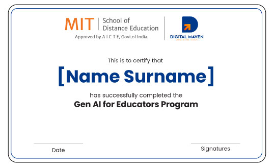 You’ll earn a “Certified AI Educator” credential, jointly awarded by MITSDE & Digital Maven.